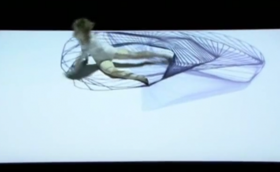 Computer graphics are generated in real-time based on the dancer's movements and projected onto the stage.