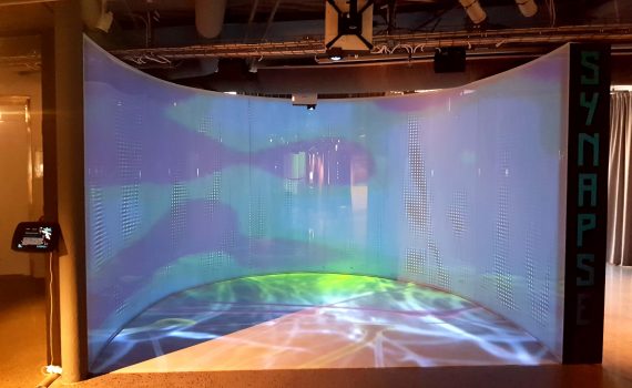 Synapses consists of interactive visualization program. The program projects on the floor and walls of room making it alive depending on how visitors move, activate sound and light.
