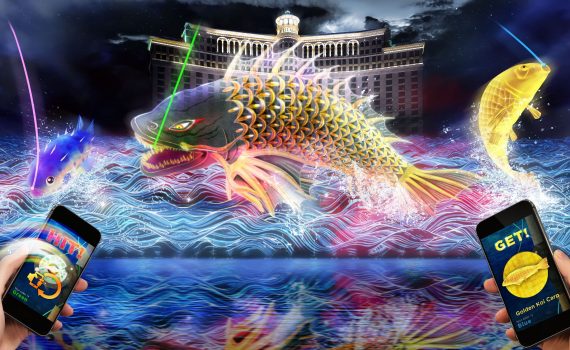 Projection on a controlled fountain waterscreen of full-length 260m. Use your smartphone as a fishing reel and join forces with other participants, spin you reel round and round to haul in a fish. If you are successful the fish appears in your smartphone.