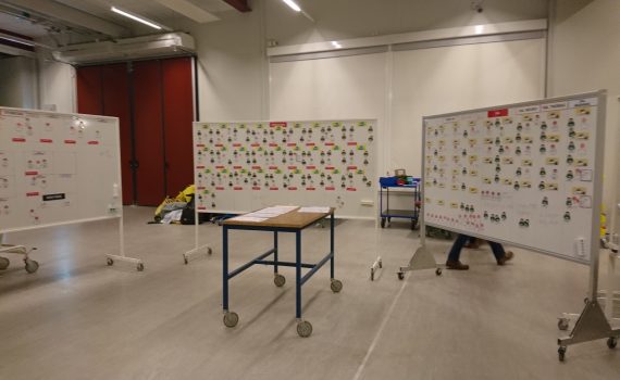 As a simulation of events following a major accident is unfolded by an instructor, the participants in training manipulate the physical model of a hospital ward with representations of patients and of medical care resources.