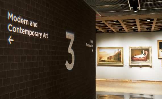 Signage information is projected on walls and other architectural surfaces in ways that blend as deeply as possible with the physical surface materials.